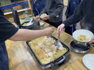 地元のスタッフと一緒に、北海道ならではの郷土食を作ります。今年は鮭のちゃんちゃん焼きなどを作りました。