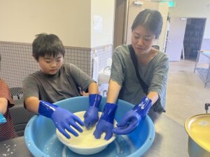 搾りたての牛乳でチーズ作りも行いました。牛乳にお酢をいれて熱湯でこねていくと、少しずつ固まっていく不思議な感覚と、出来立てのフレッシュな味わいは一生の宝物です。
