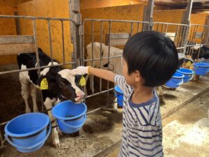 酪農の歴史が息づく八雲で、酪農家の小栗さんのもと、大きな牛の体に触れ、その温かさに驚く子供たち。一生懸命にミルクを飲む子牛の力強さを感じたり、牧草地の広大さを身をもって感じました。